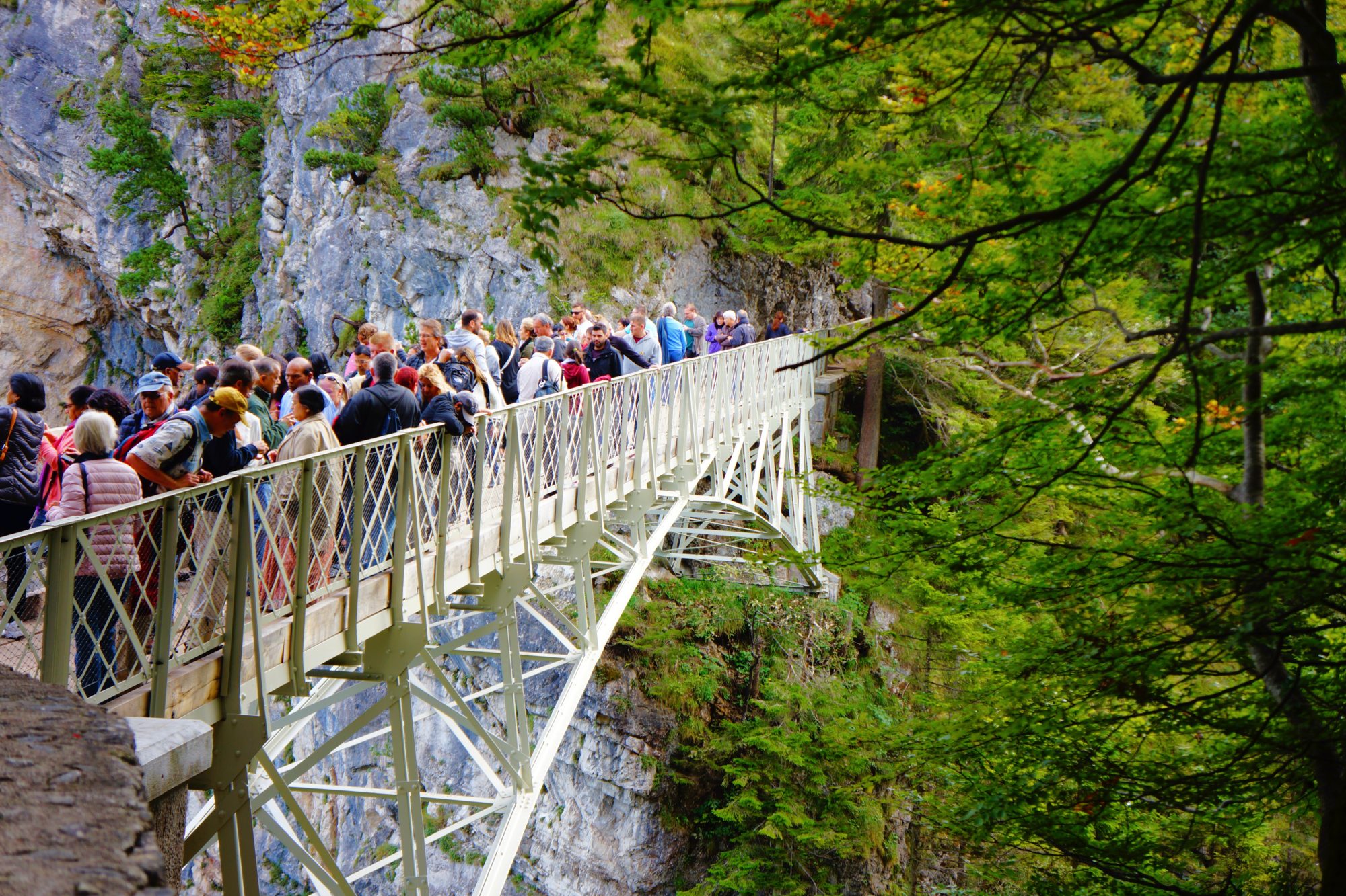 Infrastruktura turystyczna w okolicy zamku jest bardzo rozbudowana – znajdziecie tu informację, kasy biletowe, kilka parkingów, bary i restauracje serwujące wursta wszelakiej maści. Do zamku i najsłynniejszego punktu widokowego na moście można dostać się na piechotę, ale podejście jest stosunkowo długie (ok. półtorej godziny spaceru) i dość intensywne, bo praktycznie cały czas pod górę. Dlatego pod zamek kursują autobusy (1,50 euro za bilet w jedną stronę – pod górę lub 2,60 euro za bilet tam i z powrotem). Do celu można także dotrzeć bryczką za 5-6 euro od osoby. Można zwiedzać wnętrze zamku, ale my naszą wizytę ograniczamy do podziwiania go z zewnątrz, z najlepszego punktu widokowego Marienbrücke (Queen Mary’s Bridge), bo Neuschwanstein wygląda najlepiej oglądany z większej odległości. Z bliska i w środku zaczyna razić już o wiele lepiej widoczny, dziwny, eklektyczny i raczej tandetny styl, w którym lubował się Ludwik II. Most Marii znajduje się nad stumetrową przepaścią, dokładnie naprzeciwko zamku. Mimo długiego czasu oczekiwania na autobus przekonujemy się, że warto było przymknąć oko na to, czego zazwyczaj unikamy – na tłumy turystów. Zjawiskowa panorama z zamkiem niczym z bajki zdecydowanie zasługuje na to, by chciał ją zobaczyć na własne oczy każdy. Lawirowanie między Niemcami, Hiszpanami, Japończykami i przedstawicielami narodowości z całego świata rekompensujemy sobie (poza podziwianiem symbolu dzieciństwa) pysznym currywurstem z frytkami.