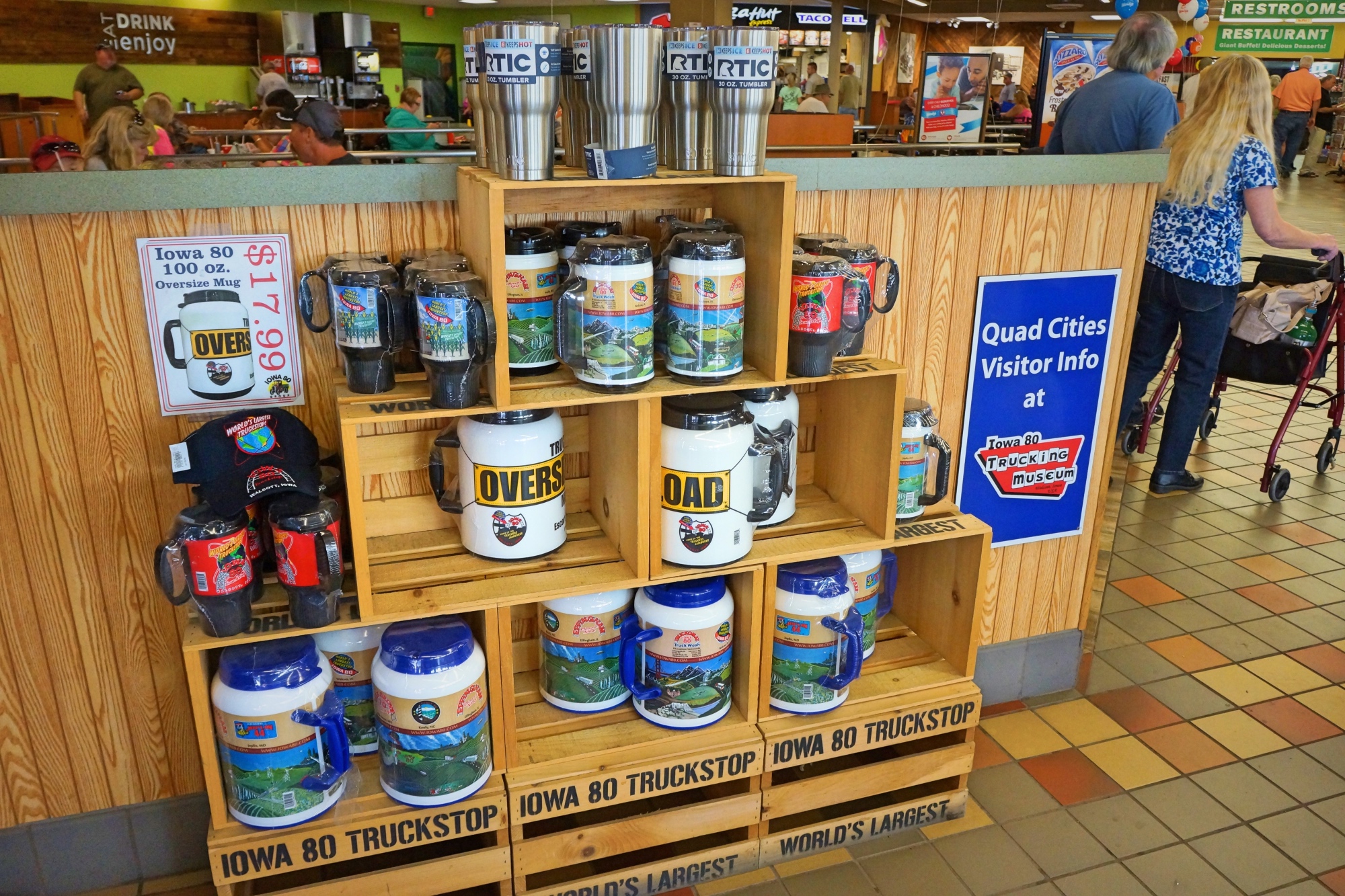 To nie jest regał z suplami, tylko z kubeczkami dla kierowców. Te z najniższej półki mają pojemność 1 galona, czyli prawie 3,8 litra. Podobno najtwardsi truckersi podróżują z takimi dwoma – jeden na kawę, a drugi na gazowane napoje (czyli w zasadzie cukier).